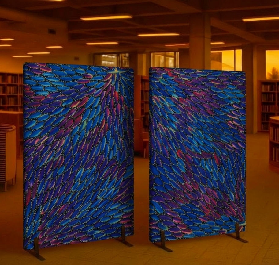 Discover the essence of Australian heritage with the 1800Highx1000Wide Partitions in Indigenous Fabric, exclusively from Rivergum Range. These freestanding partitions beautifully integrate traditional Aboriginal designs, making them a perfect addition to any space. Crafted by Australia's premier manufacturer, they offer both style and functionality. Embrace sustainable luxury with a touch of cultural significance, ideal for offices, homes, and communal areas. They are great for dividing areas or just using as artwork and also come with timber plaques with the artist's name and details on the artwork. Elevate your interior with our unique, ethically sourced partitions that honour Australia's Indigenous artistry.