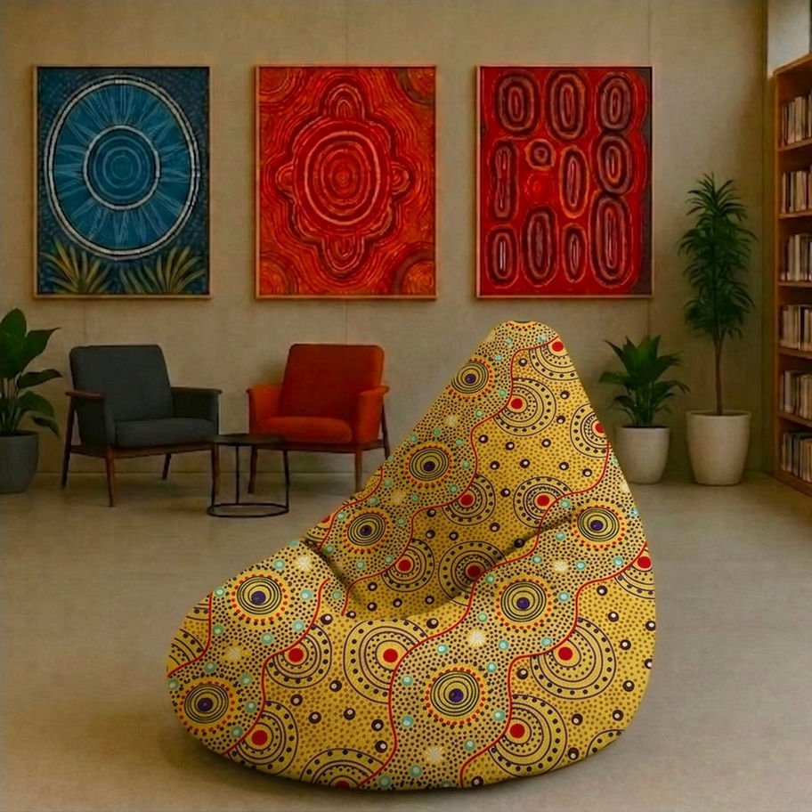100cm x 90cm x 90cm Bean Bags Discover the elegance and comfort of Rivergum Range's Indigenous Bean Bags filled with crumbed foam, a true testament to Australia's rich Aboriginal heritage. Perfect for any setting, our bean bags blend traditional design with superior comfort, making them ideal for relaxing and unwinding. As Australia's premier manufacturer and supplier of Freestanding Partitions, Bean Bags, and Aboriginal furniture, we are dedicated to celebrating and preserving indigenous artistry. Bring a piece of history and culture into your space with these meticulously crafted pieces from Rivergum Range. Picture shown depending on how much foam is in Bean bags or the way you have shaped it.