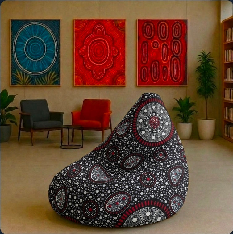 100cm x 90cm x 90cm Bean Bags Discover the elegance and comfort of Rivergum Range's Indigenous Bean Bags filled with crumbed foam, a true testament to Australia's rich Aboriginal heritage. Perfect for any setting, our bean bags blend traditional design with superior comfort, making them ideal for relaxing and unwinding. As Australia's premier manufacturer and supplier of Freestanding Partitions, Bean Bags, and Aboriginal furniture, we are dedicated to celebrating and preserving indigenous artistry. Bring a piece of history and culture into your space with these meticulously crafted pieces from Rivergum Range. Picture shown depending on how much foam is in Bean bags or the way you have shaped it.
