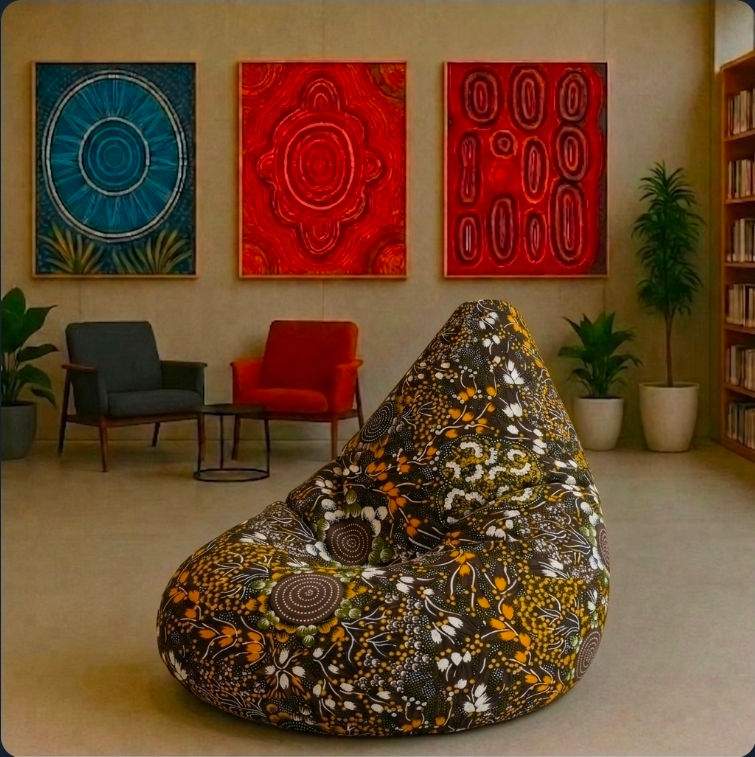 100cm x 90cm x 90cm Bean Bags Discover the elegance and comfort of Rivergum Range's Indigenous Bean Bags filled with crumbed foam, a true testament to Australia's rich Aboriginal heritage. Perfect for any setting, our bean bags blend traditional design with superior comfort, making them ideal for relaxing and unwinding. As Australia's premier manufacturer and supplier of Freestanding Partitions, Bean Bags, and Aboriginal furniture, we are dedicated to celebrating and preserving indigenous artistry. Bring a piece of history and culture into your space with these meticulously crafted pieces from Rivergum Range. Picture shown depending on how much foam is in Bean bags or the way you have shaped it.